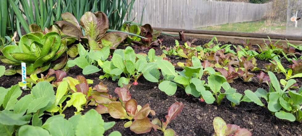 Trotz kaltem Wetter und Trockenheit wächst es gut im Gemeinschaftsgarten. Die Hochbeete quellen über von Salat, Spinat, Radieserl…